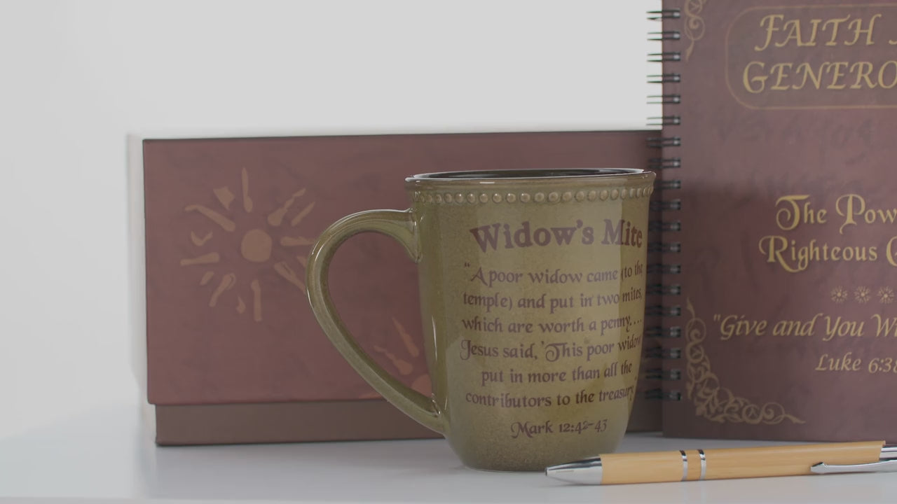 This set includes a wood pen and a journal that contains 150 pages and is approximately 8.25" x 6.5" x 1". Also included is our widow's mite ceramic mug that commemorates the act of the widow that gave everything that she had in Mark 12:42-43. This set would be the perfect gift for the man in your life or a gift for a friend who loves to study, take notes and grow in their giving through their faith in God!
