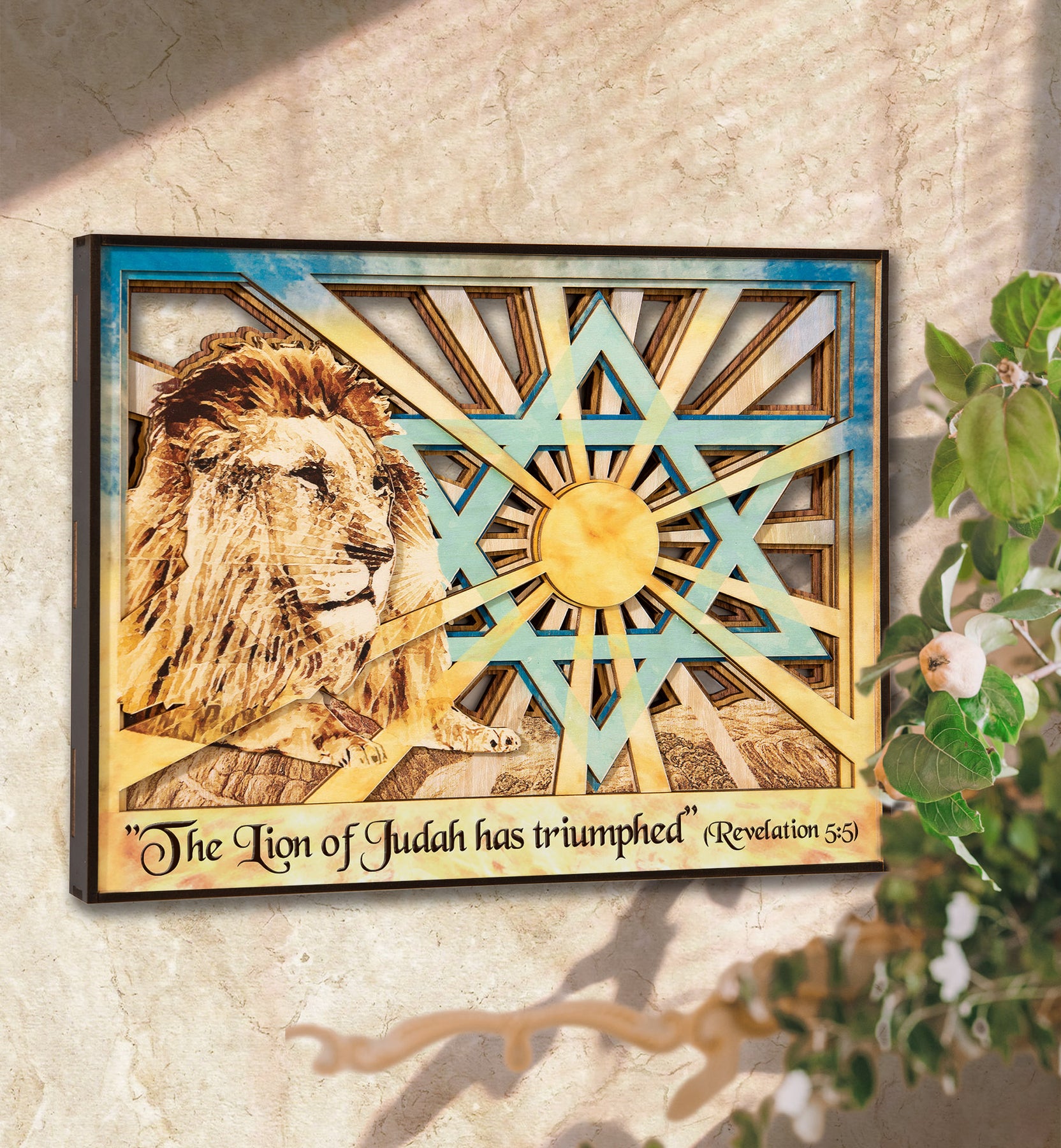 Masterfully cut wood pieces are layered to create this one of a kind wall art! Revelation 5:5 reminds us that "The Lion of Judah has triumphed"!