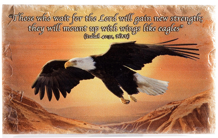Stone portrait of an eagle with the text from Isaiah 40:31 printed on the cover: "Those who wait for the Lord will gain new strength; they will mount up with wings like eagles." Comes in an attractive box with a stand suitable for displaying.