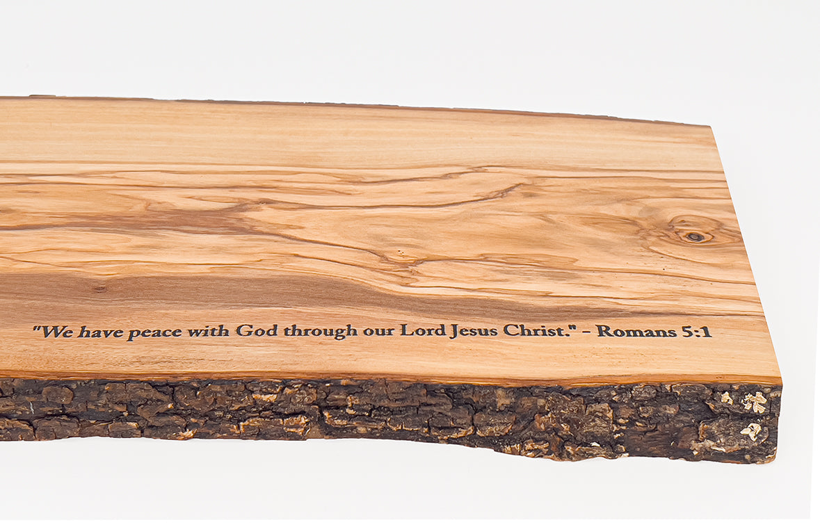 Our gorgeous polished plank which is perfect for charcuterie comes from Israeli olive trees and features live edges and is inscribed with Romans 5:1: