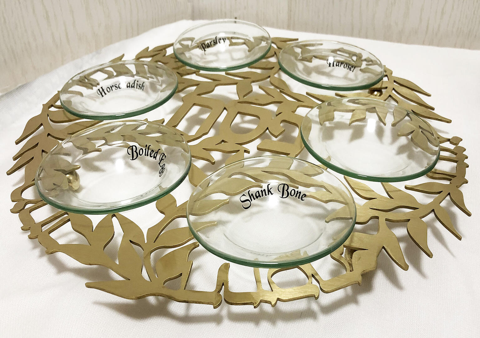 This plate is beautifully decorated with laser cut olive leaves around the plate that includes the Hebrew words for each item of the plate. The glass bowls (2.5") which are dishwasher safe also includes the English words for each item. This plate would be the highlight and talk of your Passover table! A great gift idea for Passover!