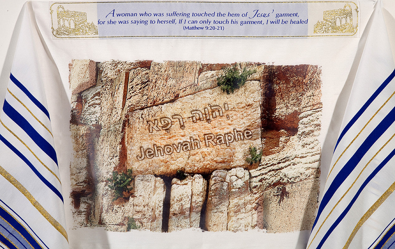 To encourage the believer's faith, this prayer shawl has four scriptures on healing in English on the four corners, with the verse from Matt 9:20-21, "…if I can only touch his garment…" on the crown. In the center of the prayer shawl is the name of God, "Jehovah Raphe" in English and Hebrew.